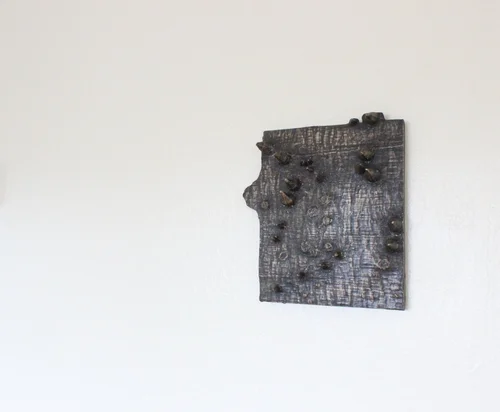 Textile, stone, wallpaper, handwritten notes, house key, resin.